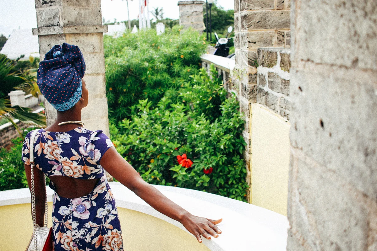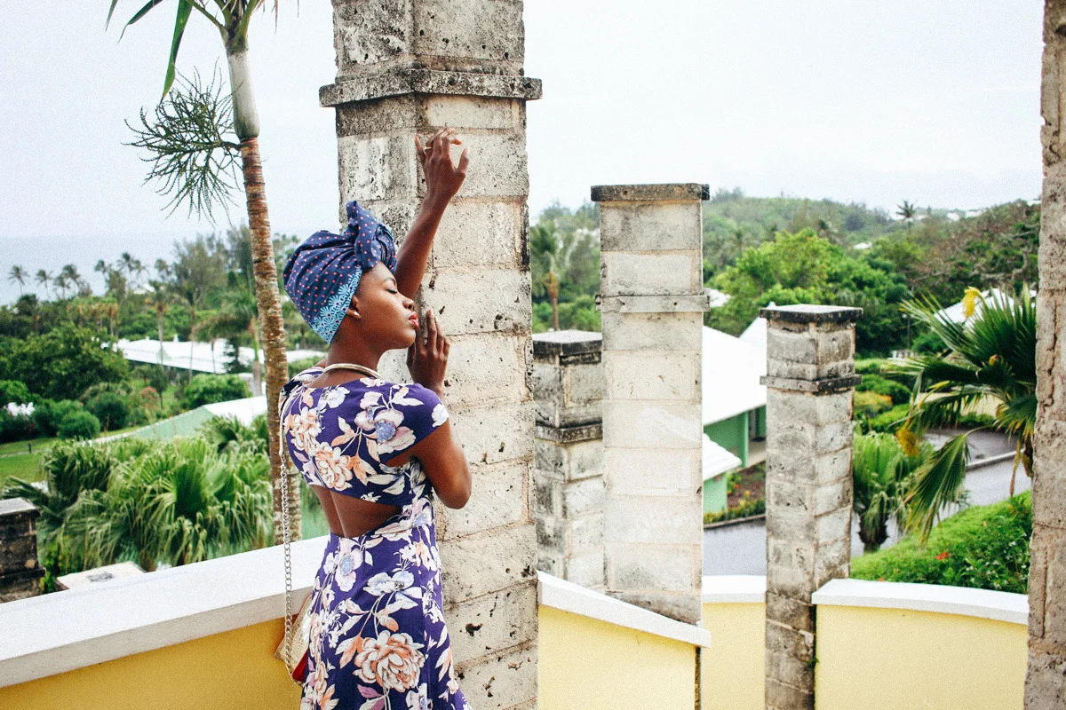 Bermuda is hot and humid, so I chose a breathable dress that would allow me to move freely and not feel too sticky. I paired the dress with blue and pink polka dot Fanm Djanm headwrap and nude ankle strap high heeled sandals. I love a thicker heel and a platform because I move around a lot and comfort is always key. My small purse was thrifted, I just love the pop of pink and silver straps it comes with.